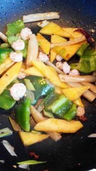 2. 角瓜青椒炒肉丝:将切好的角瓜青椒和肉丝一起炒,加入适量的生抽、老抽、料酒,炒至肉丝变色,再加入青椒一起翻炒,最后加入适量的盐、鸡精调味即可。